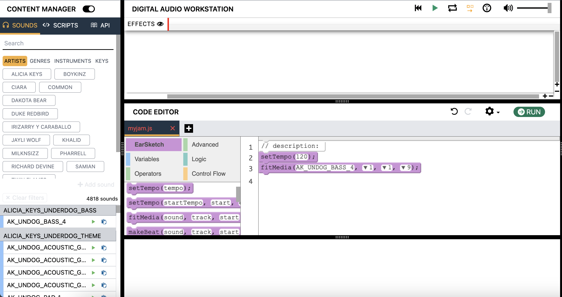 fitMedia()function is the backbone to making music in Earsketch. We will be using this function a lot, so if you have any questions regarding its usage, please ask!