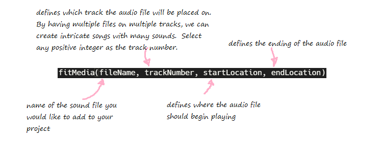 fitMedia()to insert the function between thesetTempandfinishfunctions.You may notice that when you paste the function, Earsketch produces some placeholder texts that we will need to replace later. These placeholder texts are also known as