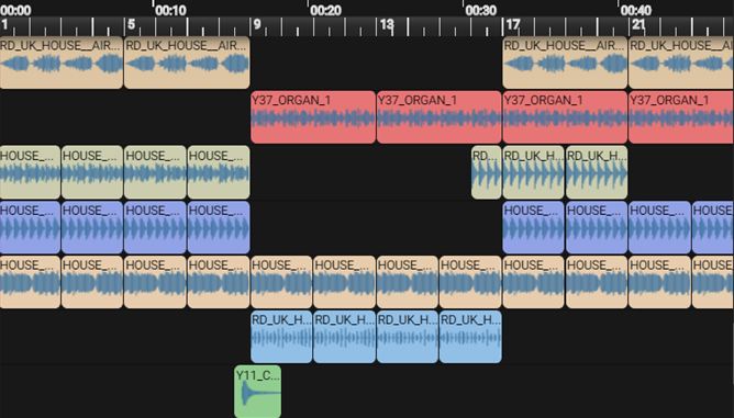 Digital Audio Workstation (DAW) is the area which the sounds appear in. It is at the center top of your EarSketch window. The following is an example of how different sections of a song may look in the DAW.