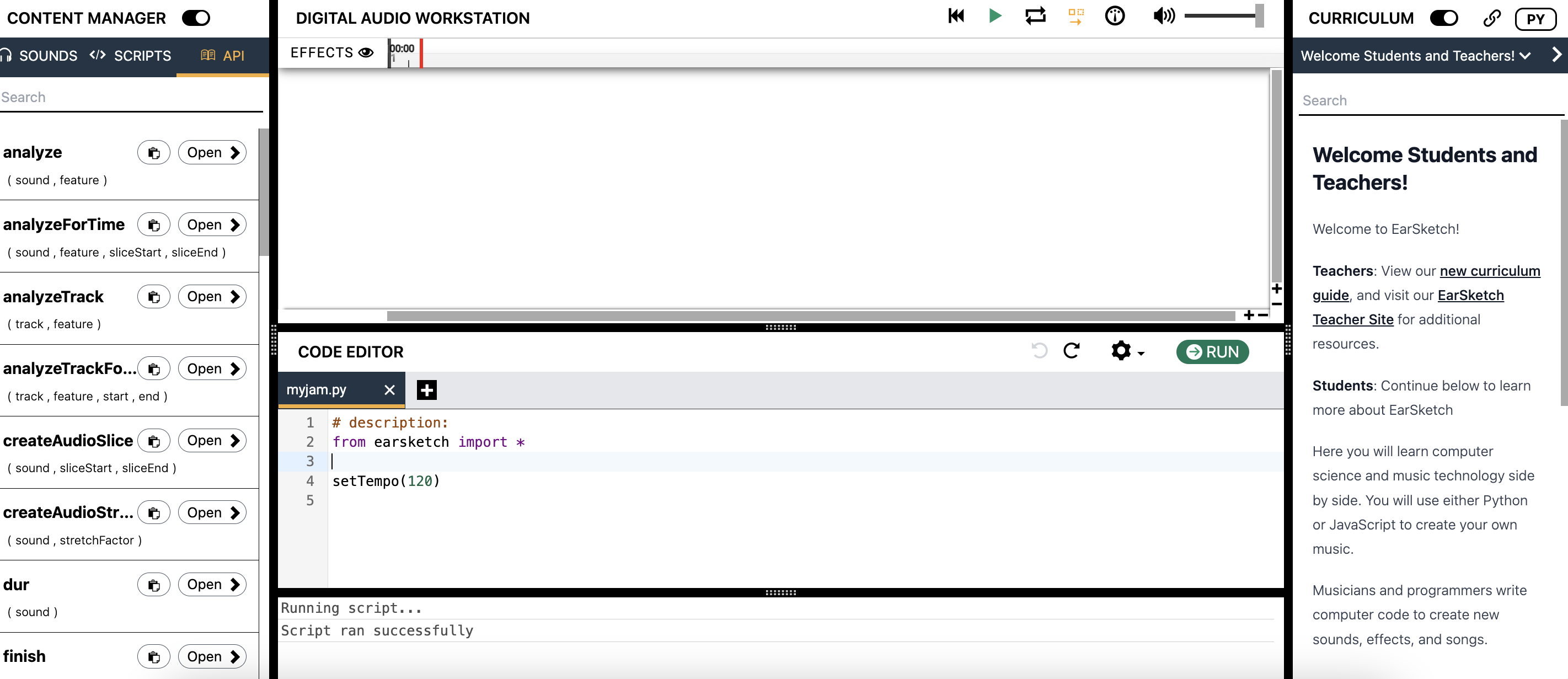 fitMedia()function is the backbone to making music in Earsketch. We will be using this function a lot, so if you have any questions regarding its usage, please ask!